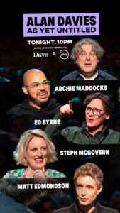 See Ed on Alan Davies: As Yet Untitled. It screens on Tuesdays at 10pm on Dave, and box set on UKTV Play.
